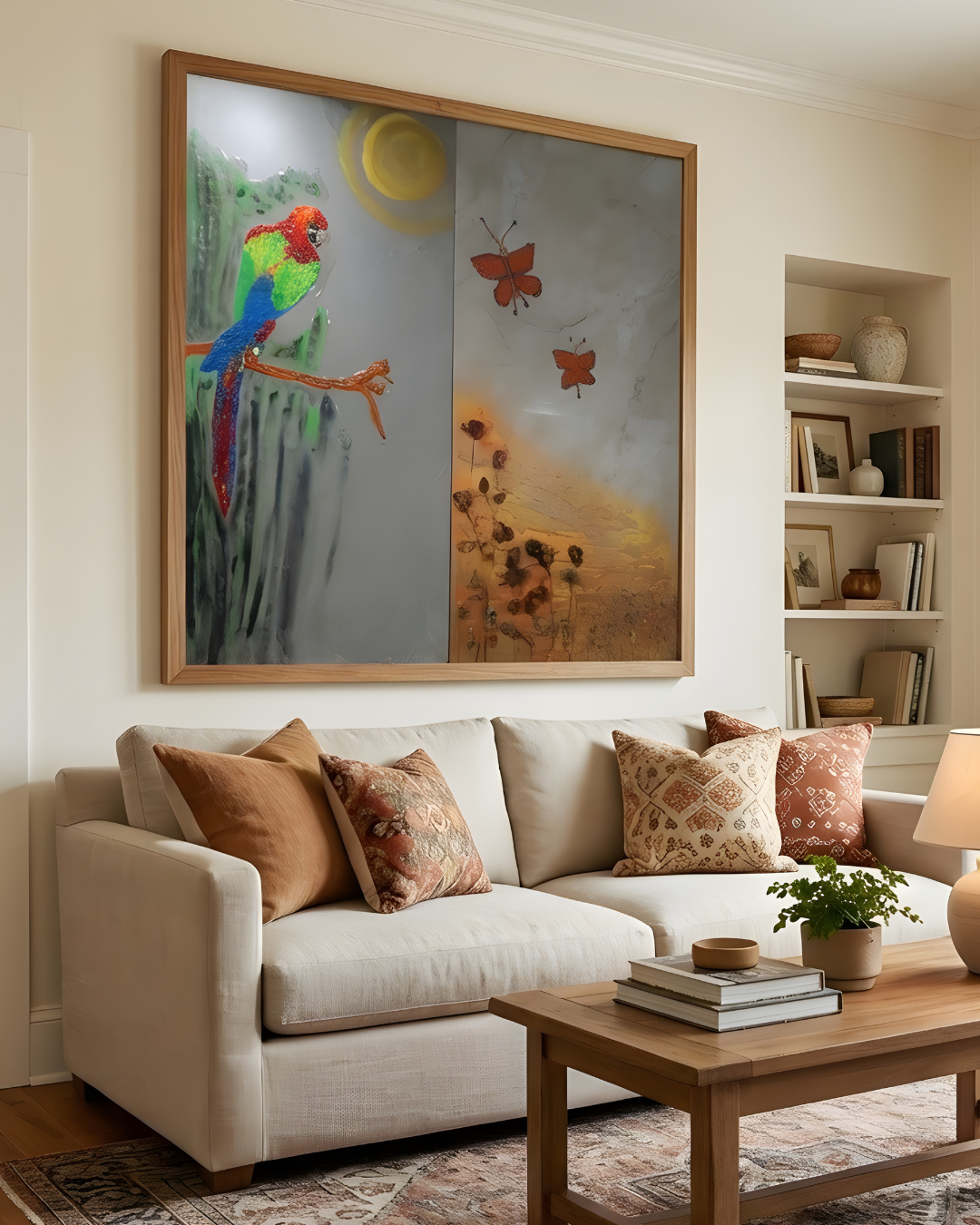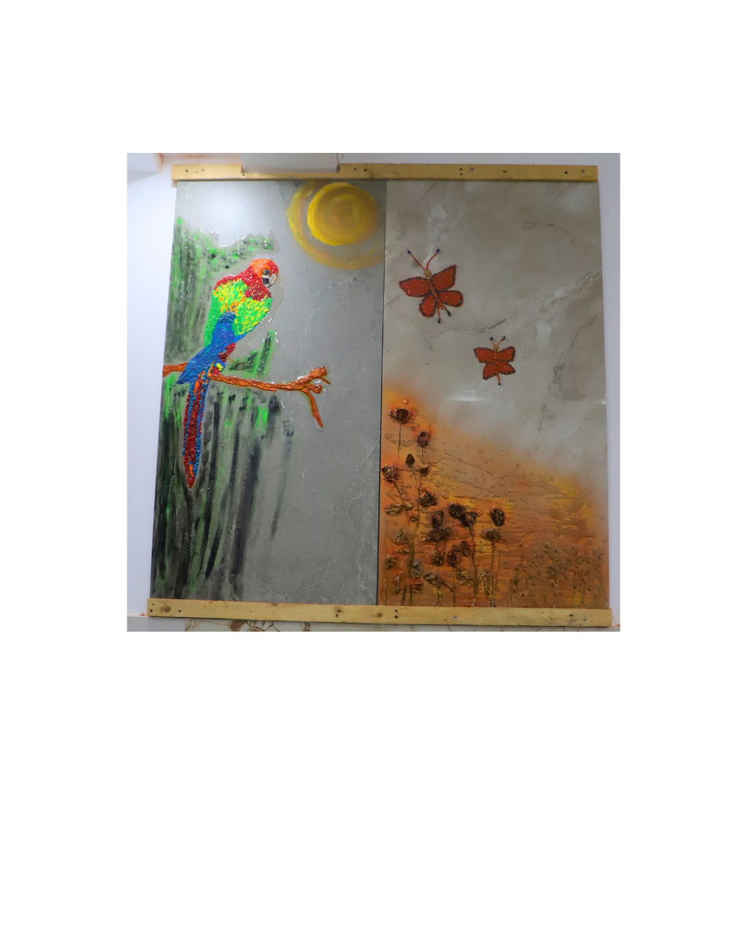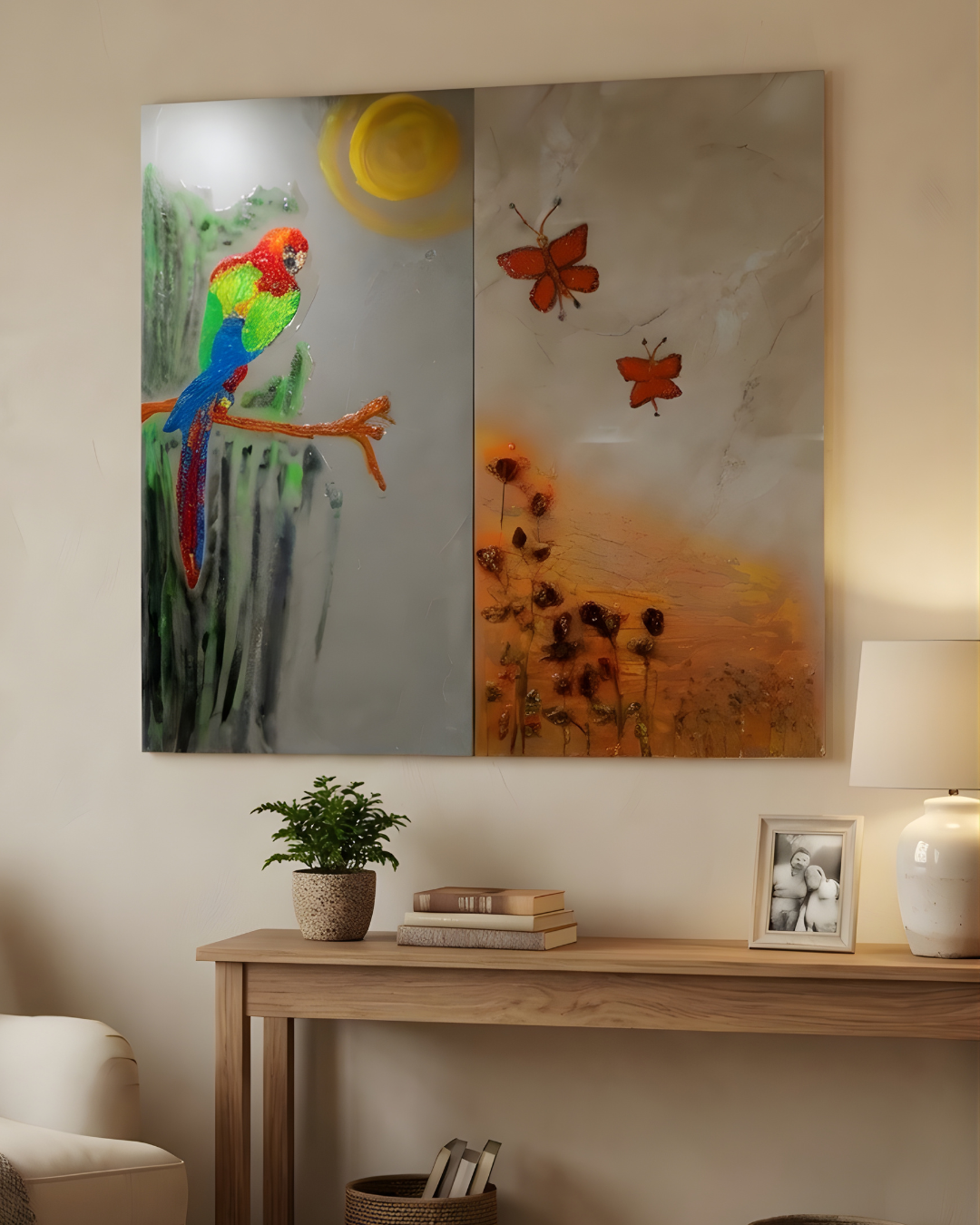 A handcrafted epoxy resin wall panel inspired by tropical nature, featuring a vibrant parrot, fluttering butterflies, and warm sunlit tones. Perfect for creating a luxurious, artistic statement in modern interiors.